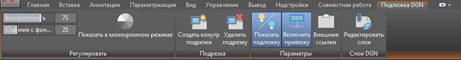 Если в чертеже выбрана подложка DGN, на ленте отображается контекстная вкладка "Подложка DGN".
