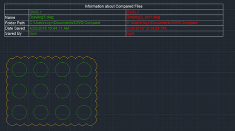 На следующем изображении показаны данные о свойствах двух сравниваемых файлов, вставленные в виде таблицы в сравнительный чертеж.