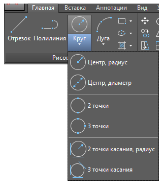 По умолчанию команда КРУГ задает центральную точку и радиус.