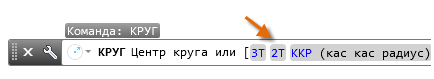 Кроме того, можно ввести в командной строке КРУГ или К и щелкнуть параметр, чтобы выбрать его. При этом можно задать центральную точку или щелкнуть один из выделенных параметров команды, как показано далее.