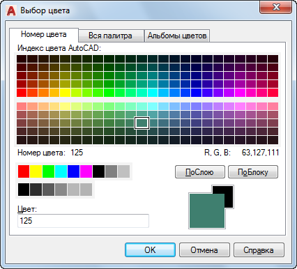Можно выбрать цвет для элементов окна из 255 цветов, входящих в Индекс цветов AutoCAD (ИЦА), а также из всей палитры или из альбома цветов, используя три предоставленных вкладки.