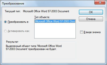 Задает режим преобразования типа внедренного объекта в тип, указанный в списке "Тип объекта".