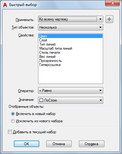 Позволяет применить заданные критерии ко всему чертежу или к текущему набору (если он существует).