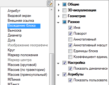 Если в категориях "Пользовательские" и "Атрибуты" установлены флажки, динамические свойства и атрибуты блока отображаются в палитре "Быстрые свойства".