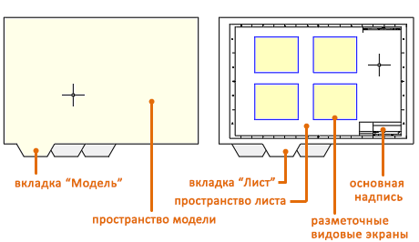В области листа, которая называется пространство листа, можно добавить основную надпись, отобразить масштабированные виды пространства модели с помощью видовых экранов листа, а также создать таблицы, спецификации, примечания и размеры для чертежа.