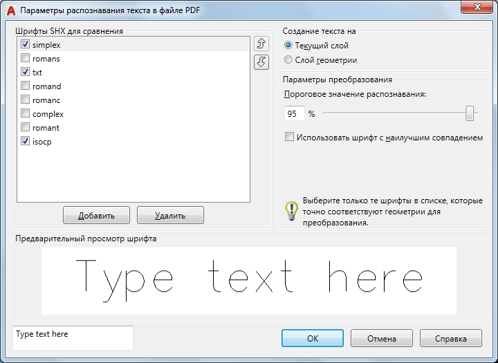 Добавление шрифта SHX в список для сравнения.