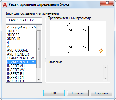 При нажатии "ОК" это определение блока открывается в редакторе блоков. При выборе <Текущий чертеж> текущий чертеж отображается в редакторе блоков.