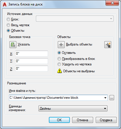 Задание нового имени и расположения файла, а также указание единиц измерения, используемых при вставке блока.