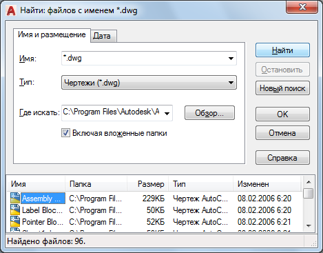 Тип искомых файлов задается в списке "Тип". Следовательно, задавать расширение файлов в поле "Имя" нет необходимости. Например, для того чтобы найти файл house102.dwg, следует ввести house* в поле "Имя" и из списка "Тип" выбрать "Чертежи" (файлы с расширением .dwg).