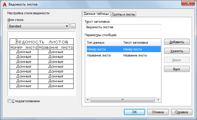 Список свойств столбцов ведомости листов. Каждая строка в списке соответствует одному столбцу. В ведомости столбца следуют в том же порядке (слева направо), что и записи о них в данном диалоговом окне.