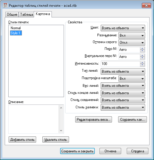 Стили печати отображаются каждый в отдельном столбце, слева направо. Как правило, если количество стилей печати невелико, удобнее пользоваться вкладкой "Таблица". При большом количестве стилей предпочтительнее работать на вкладке "Карточка". На ней все имеющиеся стили перечислены в списке в левой части, а правая часть занята описанием свойств одного выбранного стиля. Стиль NORMAL расположен в начале таблицы именованных стилей печати и является свойством по умолчанию для объектов (стиль печати не назначен). Стиль NORMAL нельзя изменить или удалить.