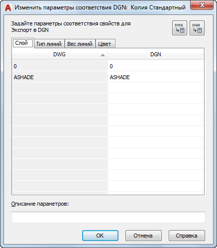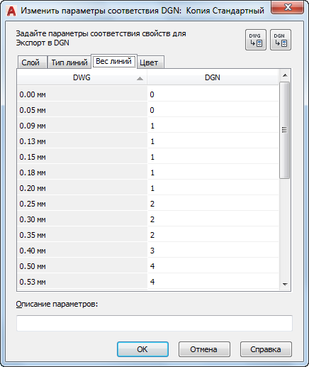 Параметры соответствия для экспорта: Если диалоговое окно "Изменить параметры соответствия DGN" вызвано путем создания нового набора параметров соответствия в диалоговом окне "Параметры экспорта в DGN", в столбце "DWG" содержатся все типы линий, определенные в текущем чертеже. Если ячейка назначения пустая (правый столбец), используется заданное по умолчанию значение соответствия системы.