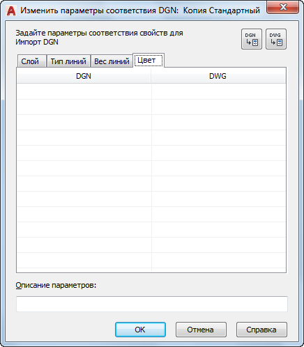 Диалоговое окно "Изменить параметры соответствия DGN" содержит следующие вкладки: