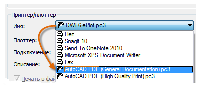 В раскрывающемся списке "Принтер/плоттер" выберите AutoCAD PDF (General Documentation).pc3: