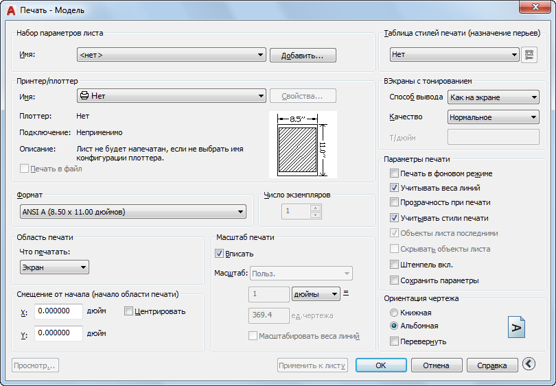 Для удобства можно сохранить и восстановить наборы этих параметров по имени. Они называются наборами параметров листа. Наборы параметров листа позволяют сохранять параметры, необходимые для различных принтеров, печати в оттенках серого, создания файла PDF из чертежа и т. д.
