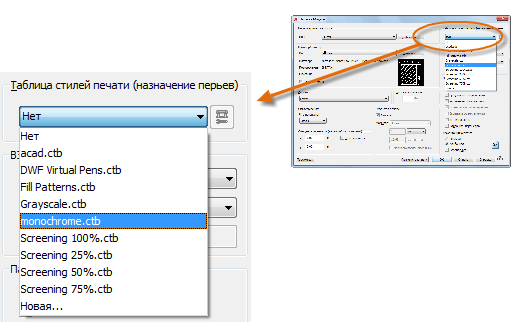 В таблице стилей печати содержится информация об обработке цветов. Цвета, которые хорошо смотрятся на экране монитора, могут не подходить для файла PDF или для печати. Например, может потребоваться создать цветной чертеж с монохромным выводом. Вот так можно задать монохромный вывод: