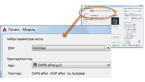 При выводе на печать можно просто указать имя набора параметров листа в диалоговом окне "Печать", и все параметры печати будут восстановлены. На следующем рисунке в диалоговом окне "Печать" установлен набор параметров листа "Hitchhiker", который создает выходной файл DWF (Design Web Format), а не выводит чертеж на плоттер.