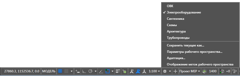 Для активизации рабочего пространства выберите имя рабочего пространства из раскрывающегося списка в строке состояния приложения.