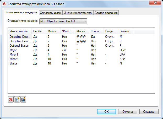 Программа обеспечивает несколько стандартов слоев по умолчанию, основанных на соглашениях промышленных стандартов именования слоев (например, стандарта объектов инженерных систем (MEP), основанного на AIA, и BS1192 — версии 2 группы AUG). При создании слоя, основанного на стандарте слоев, имя слоя имеет несколько частей, отделенных друг от друга разделителями, например дефисами. Каждая часть имени определяется по правилам, которые установлены в определении стандарта слоев. Определения стандарта слоев по умолчанию для AutoCAD MEP toolset основаны на общепринятых в проектировании стандартах для слоев. Например, согласно стандарту MEP для слоев объекта, имя слоя для воздуховода — M-Duct-Std.