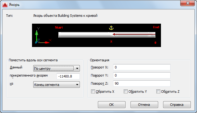 Якорь связывает объект AutoCAD MEP toolset с другим объектом или с разметочной кривой или сеткой. В области "Трубопровод" эта электронная таблица применяется к фитингам, в которых используются якоря (таким как врезки). В области "Схемы" она применяется к обозначениям. Здесь можно просмотреть и изменить точки вставки X, Y и Z в текущей системе координат, а также угол поворота закрепленного якорем объекта. Можно перемещать прикрепленные якорем объекты вдоль оси сегмента путем определения местоположения через расстояние или путем обращения якоря вокруг оси X, Y и Z. Вкладка "Якорь" доступна только после выполнения операции прикрепления объектов с помощью инструмента "Якорь".