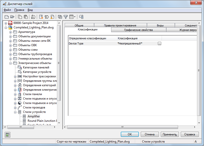 Поскольку часто возникает необходимость классификации устройств на чертеже по их типу, в состав приложения AutoCAD MEP toolset включено применяемое к устройствам определение классификации «Тип устройства». Это определение содержит классификации типов устройств, имеющих определения в программе.