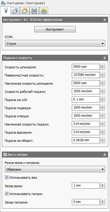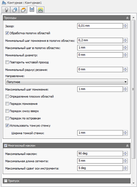 При финишной обработке контуров вдоль контуров деталей создаются траектории перемещения инструмента с постоянной высотой Z. Шаги по оси Z разнесены по ней в соответствии с параметром понижения.