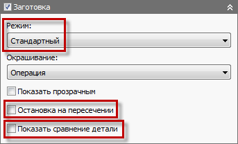 В стандартном режиме отображаются флажки Остановка на пересечении и Показать деталь сравнения. Установите флажок Остановка на пересечении, чтобы остановить моделирование заготовки при пересечении вала, патрона и приспособления. Установите флажок Показать деталь сравнения, чтобы показать заготовку и деталь сравнения. При этом красным цветом указывается врезка в деталь, а синим — наличие лишнего материала.