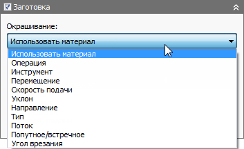 Моделирование заготовки позволяет добавить цвет в соответствии с несколькими различными критериями обработки, например встречное/попутное фрезерование и направление резания. Это позволяет выполнять визуализацию потенциальных проблем до начала обработки детали. Раскрашивание заготовки часто обеспечивает быстрый и тщательный обзор потенциальных проблем обработки, относящихся к качеству детали и характеристикам резания.