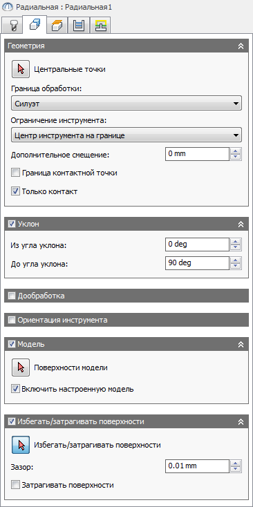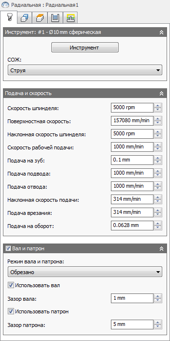 Радиальный и осевой припуски могут быть отрицательным числом. Тем не менее, при использовании сферической или радиусной фрезы с отрицательным значением радиального припуска, превосходящим угловой радиус, отрицательное значение осевого припуска должно быть меньше или равно угловому радиусу.