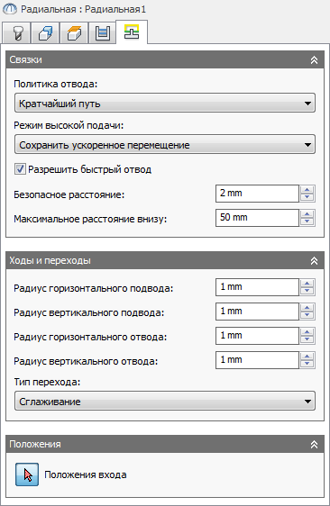 Радиус вертикальной дуги, сглаживающей движение на входе. Замеряется от начального перемещения до самой траектории перемещения инструмента.