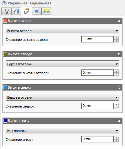 Параметр "Высота отвода" позволяет задать высоту, на которую поднимается инструмент перед следующим шагом резки. Значение высоты отвода должно быть выше значений параметров Высота подачи и Высота сверху. Параметр "Высота отвода" используется вместе с последующим смещением для задания высоты.