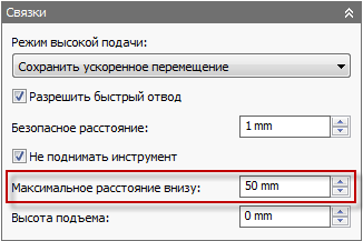 Autodesk HSM позволяет управлять размещением инструмента в нижнем положении с помощью параметра Макс. расстояние внизу, благодаря чему сокращается количество отводов. Этот параметр находится на вкладке Связки.