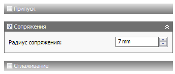 Раздел Сопряжения и параметр Радиус сопряжения находятся на вкладке Проходы между разделами Припуск и Сглаживание