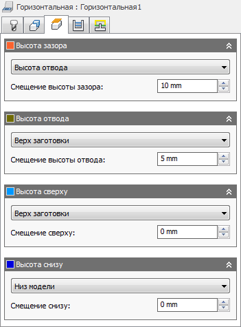 Параметр "Высота отвода" позволяет задать высоту, на которую поднимается инструмент перед следующим шагом резки. Значение высоты отвода должно быть выше значений параметров Высота подачи и Высота сверху. Параметр "Высота отвода" используется вместе с последующим смещением для задания высоты.