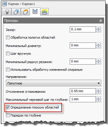 В методах 3D-очистки (Адаптивная обработка и Очистка кармана), а также в методе чистовой контурной обработки на вкладке Проходы есть настройка Определение плоских областей. При включении этой настройки в методе определяются все плоские области и корректируются шаги понижения для обеспечения остатка осевого припуска в этих плоских областях.