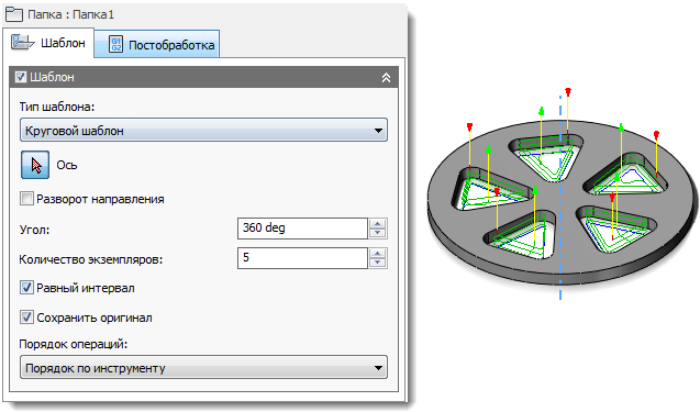 - В поле Число экземпляров введите значение 5. При этом окно предварительного просмотра обновится и для каждого экземпляра отобразится траектория перемещения инструмента.