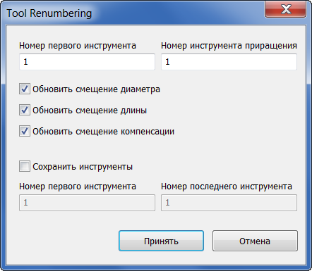 Функцию изменения нумерации можно использовать, если необходимо заполнить журнал инструментов только инструментами, требуемыми для выполнения конкретного задания.