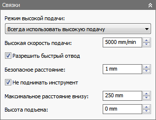 Иногда более предпочтительно использовать перемещения с высокой скоростью подачи вместо быстрых перемещений. В таких случаях можно задать Режим высокой подачи на вкладке Связки.