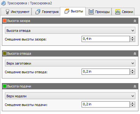 Параметр "Высота отвода" позволяет задать высоту, на которую поднимается инструмент перед следующим шагом резки. Значение высоты отвода должно быть выше значений параметров Высота подачи и Высота сверху. Параметр "Высота отвода" используется вместе с последующим смещением для задания высоты.