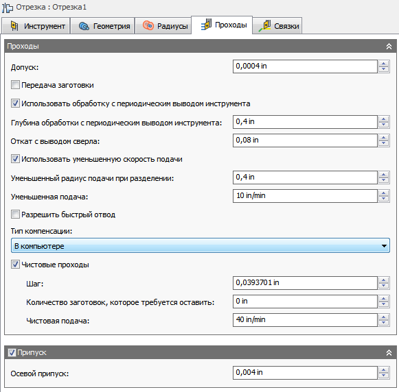 Подача на выходе при отводе режущего инструмента. Входные данные, основанные на параметрах Использовать подачу на оборот и текущего значения параметра Единицы.