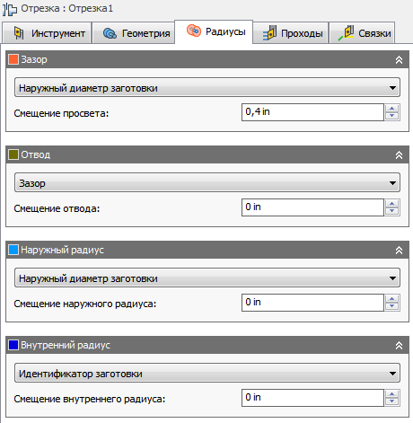 На вкладке Радиусы можно задать радиальную зону ограничения для обработки. Эти параметры выделяются цветом для облегчения идентификации.