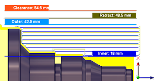 Можно задать перемещение инструмента в исходное положение до начала операции или после ее завершения. Инструмент будет выходить из заготовки на оси Х, пока не достигнет заданной высоты зазора, после чего будет возвращаться в исходное положение на оси Z. В случае применения одного и того же инструмента поочередно для нескольких операций эти параметры можно использовать для ограничения холостого хода, чтобы инструмент не возвращался в исходное положение.
