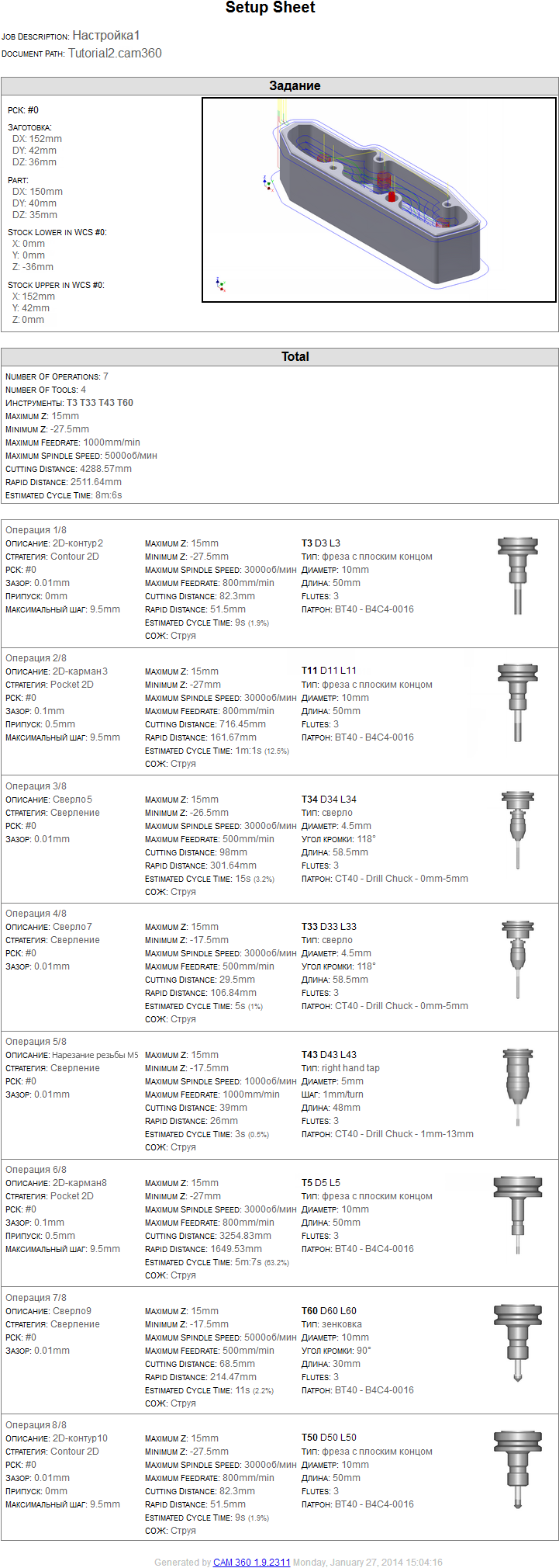 Функция Карта наладки позволяет сформировать обзор программы ЧПУ для оператора станка с ЧПУ. Autodesk HSM содержит несколько карт наладки, среди которых карта наладки в формате HTML установлена по умолчанию и является полностью адаптируемой.