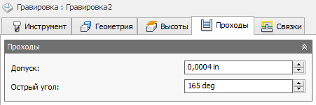 Целью гравирования является создание острых углов в кармане путем перемещения резца вдоль углового пересечения. Если угол между ребрами больше этого значения, то движение по очистке угла выполняться не будет.