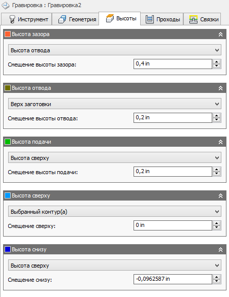 Параметр "Высота отвода" позволяет задать высоту, на которую поднимается инструмент перед следующим шагом резки. Значение высоты отвода должно быть выше значений параметров Высота подачи и Высота сверху. Параметр "Высота отвода" используется вместе с последующим смещением для задания высоты.