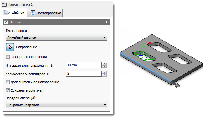 - Нажмите кнопку Направление 1 и выберите прямое ребро или отрезок эскиза в направлении, в котором необходимо создать массив операций.