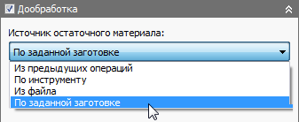 - Установите флажок Дообработка и установите для параметра Источник остаточного материала значение По заданной заготовке.