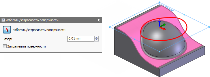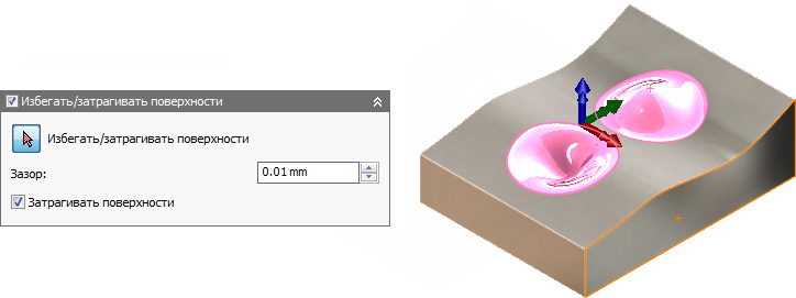 Значение избегаемой поверхности можно изменить, установив флажок Затрагивать поверхности. Если этот параметр включен, то траектория перемещения инструмента может затрагивать поверхности, заданные параметром "Избегать поверхностей", а остальные поверхности не затрагиваются.