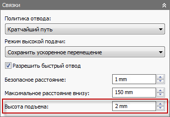 Параметр Высота подъема доступен для подходов 2D и 3D кармана, адаптивной обработки и горизонтальной очистки на вкладке Связки.