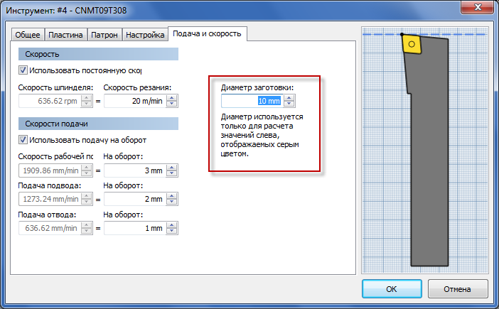 Параметры скорости резания и скорости подачи автоматически обновляются при изменении диаметра заготовки.